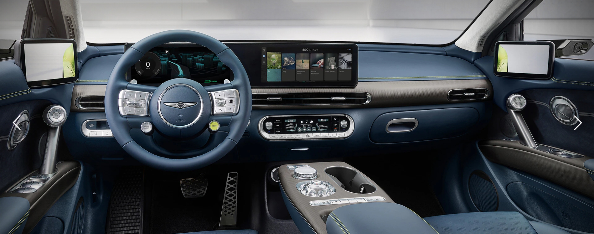 고급스러운 타원형의 핸들 디자인에 전기차 전용 버튼이 추가된 새로운 디자인으로 제작되었으며 사이드 미러를 보면 아이오닉에 적용된 디지털 사이드 미러가 적용되었습니다.
